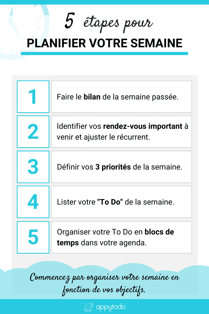 Quelle que soit votre situation, voici 5 étapes pour planifier efficacement votre semaine, et surtout les erreurs à éviter. Vous commencerez lundi avec un esprit plus léger, une vision claire et bien équipé pour gérer les dangers.