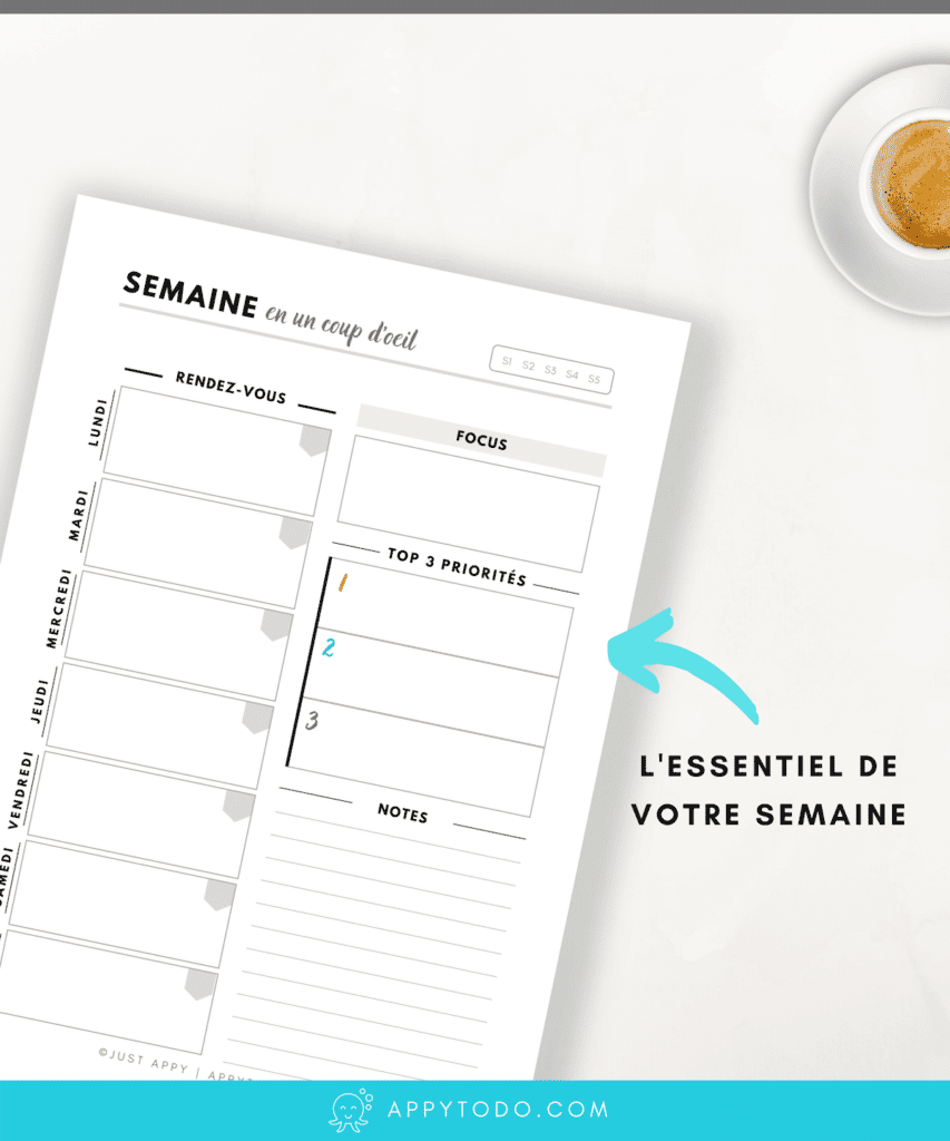- L’Appy 365 pour ceux qui préfèrent le papier : un kit de cartes à imprimer et à compléter qui contient les éléments essentiels pour planifier votre semaine, votre mois et votre année. En un coup d’œil, vous visualisez vos priorités.